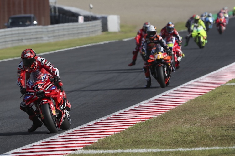 Francesco Bagnaia foi o homem do dia no GP do Japão, hoje (27), no circuito de Motegi. Finalmente se sentindo à vontade na moto, o bicampeão fez a pole position e venceu a Sprint Race, batendo o seu companheiro de equipe Marc Márquez pela primeira vez no ano.
