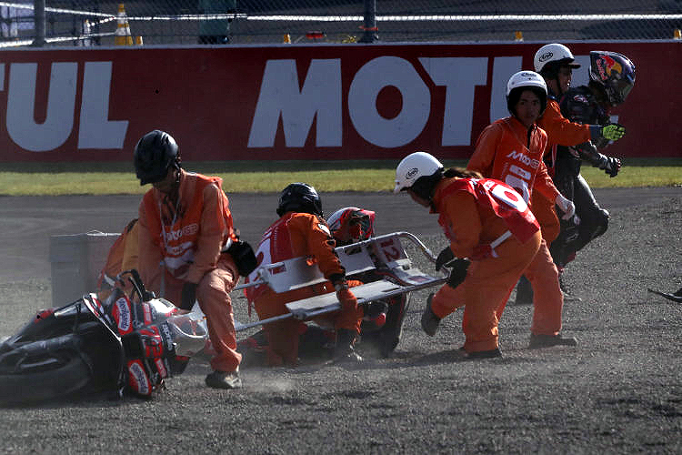 As duas Aprilia acabaram no cascalho da Curva 1. Bezzecchi escapou com uma contusão na perna direita; Martin foi levado ao Hospital Universitário Dokkyo, onde foi diagnosticado com uma fratura na clavícula direita. O que significa uma nova cirurgia e um novo período de convalescência, o terceiro esse ano.