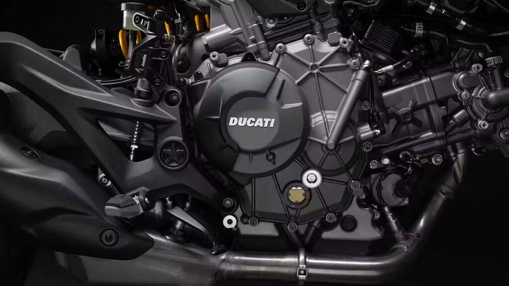 O V2 a 90 graus com válvulas variáveis é do tipo modular, ou seja, que pode ser adequado à motocicleta em questão. No caso da nova Monster, ele está rendendo 110 cv a 9.000 rpm e 67,2 lb.ft de torque a 7.250 rpm, 80% já disponíveis entre 4.000 e 10.000 rpm.