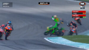 Vencedor do GP da Indonésia e eleito novato do ano, Fermin Aldeguer (Gresini Ducati) estava entre os três pilotos que abandonaram a corrida, juntamente com Bagnaia e Raul Fernandez (Trackhouse Aprilia). O estreante da Gresini sofreu um acidente no final da Curva 15, quando estava na sétima posição.