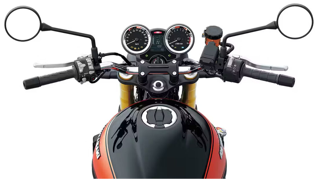 No mais, a Z900 RS recebeu válvulas de admissão controladas eletronicamente, o que habilitou a motocicleta a ter um controle de cruzeiro e um quickshifter. O controle de tração e o ABS são sensíveis ao ângulo de inclinação e o painel de mostradores analógicos conta com conectividade para smartphone, embora bem escondida.