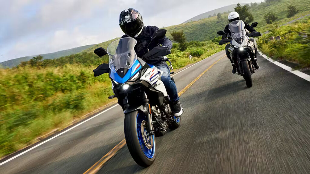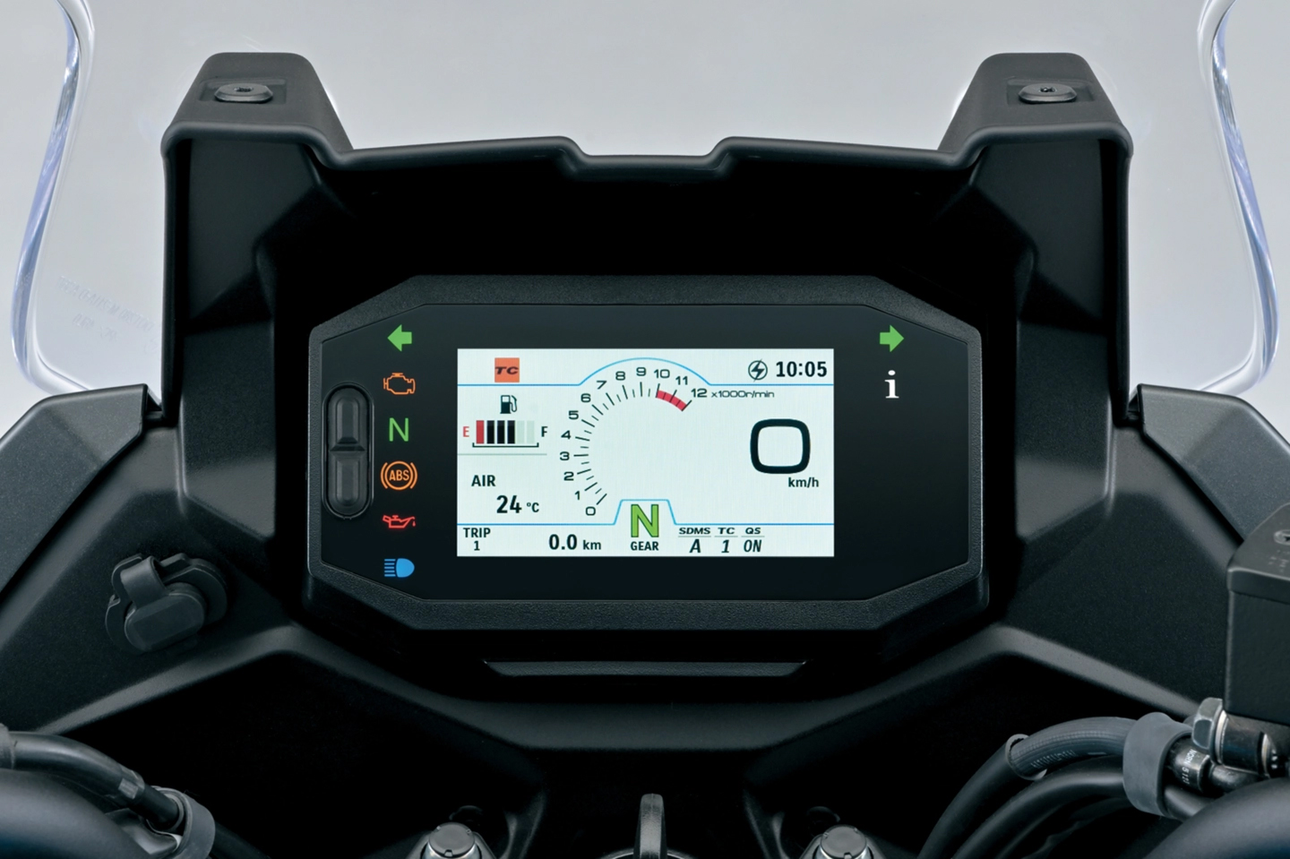Há três modos de pilotagem, controle de tração de três estágios, além de um quickshifter bidirecional, ABS de canal duplo e aquele sisteminha que levanta os giros do motor na partida a frio, tradicional da Suzuki. O assento foi remodelado com um acolchoamento mais espesso para maior conforto em longas viagens.