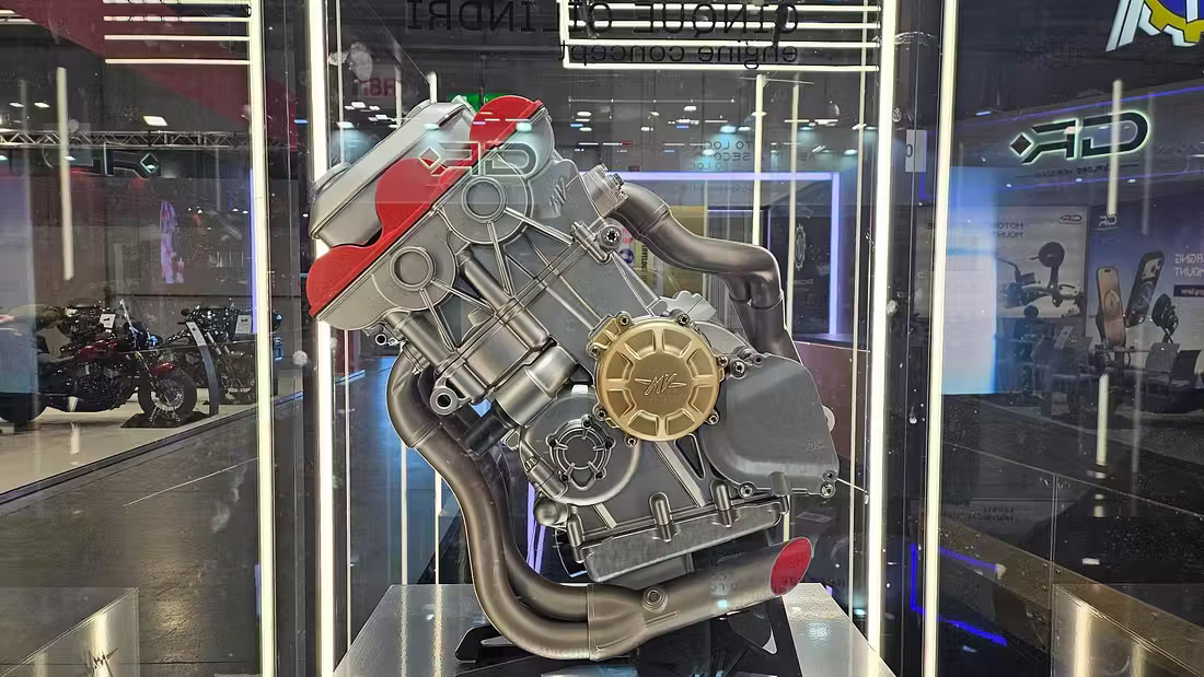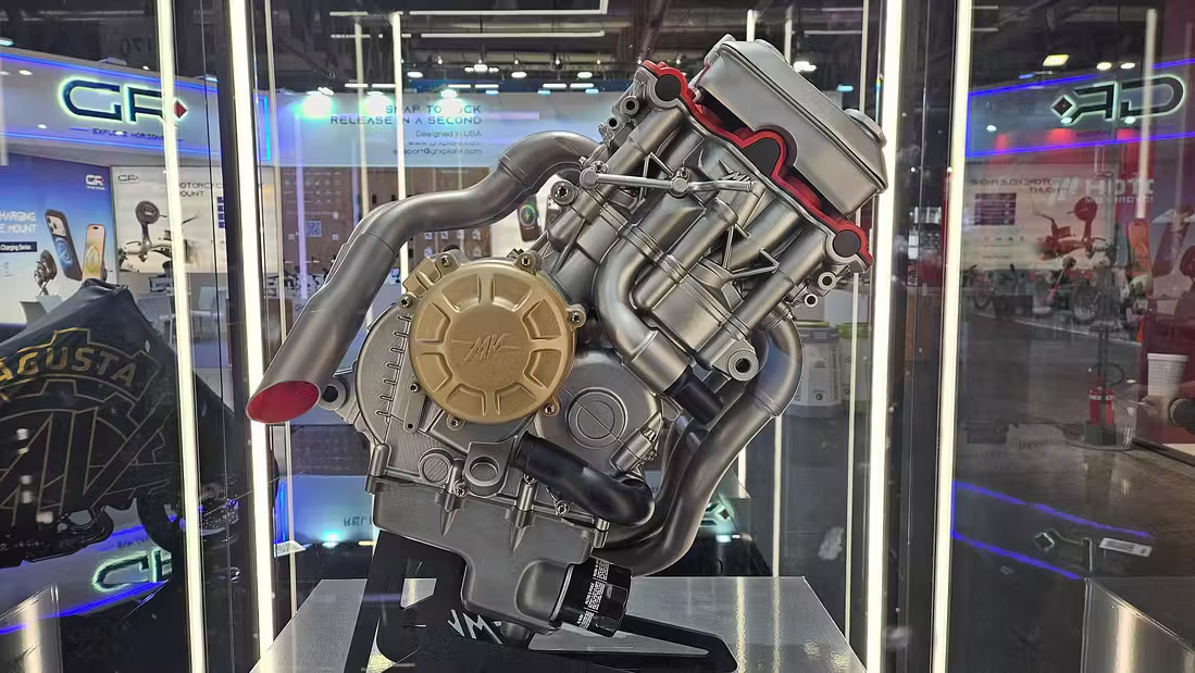 Quem disse que o motor a combustão está morto? A MV Agusta revelou no Salão de Milão um conceito de motor completamente novo com cinco cilindros, três árvores de cames e componentes auxiliares elétricos.