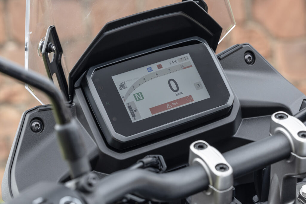 O parabrisa feito de Durabio (material sustentável e de alta transparência) se une à carenagem superior e dispõe de um duto de admissão central para reduzir a pressão do ar no capacete. Atrás dele você encontra um painel TFT de cinco polegadas onde você controla quatro modos de pilotagem (Sport, Standard, Rain e Gravel, com um modo customizavel pelo usuário.