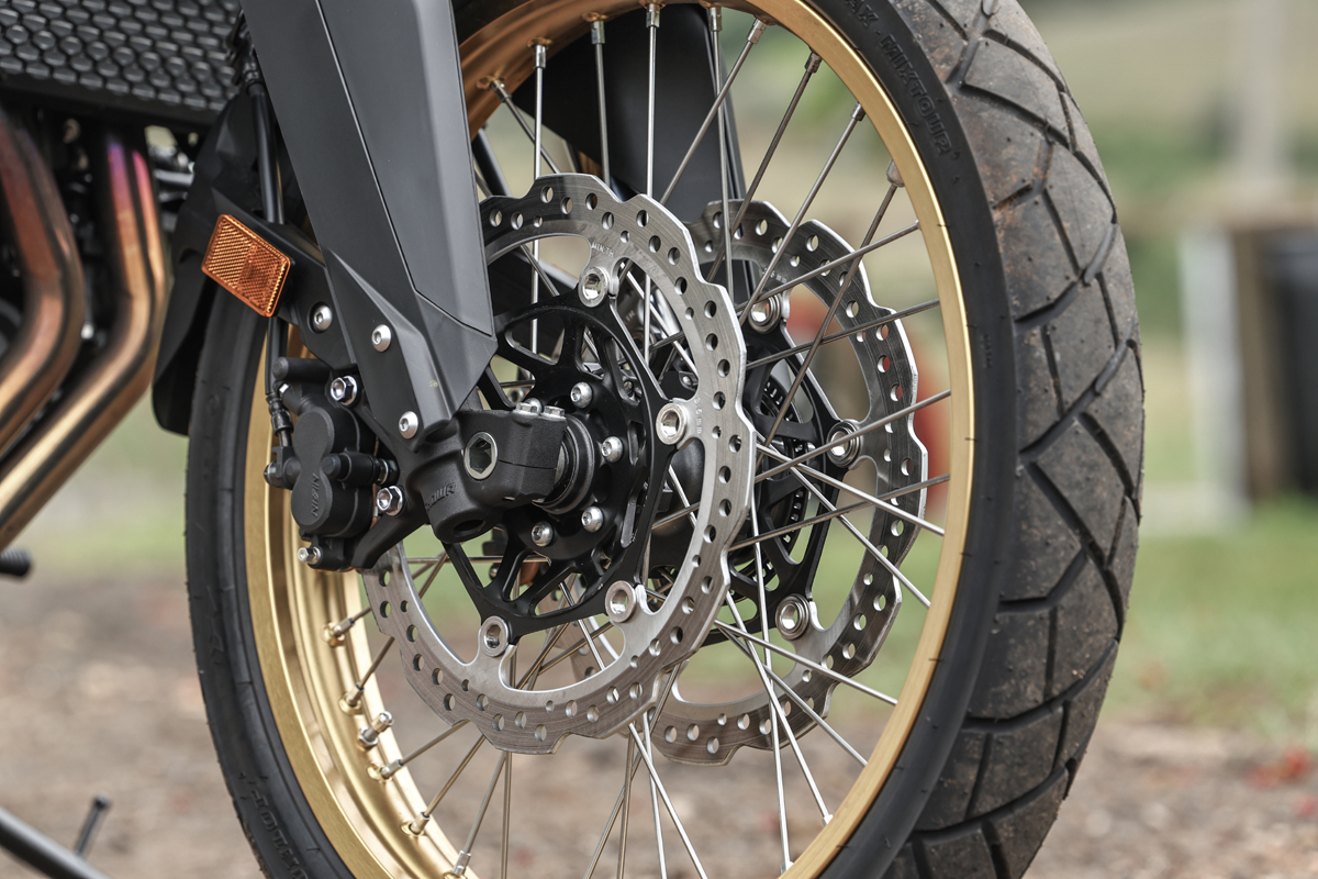 As rodas raiadas são tipicamente enduro, de 21 e 18 polegadas respectivamente, com pneus Metzeler Karoo Street ou Dunlop Mixtour. Os discos de freio dianteiros têm 310 mm de diâmetro com pinças de pistão duplo montadas axialmente com ABS. A pesa 208 kg em ordem de marcha, com todos os fluídos, incluindo 16,9 litros de combustível.