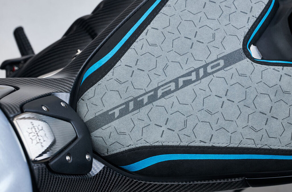 A carroceria combina diversas peças de fibra de carbono com acabamento em trama sarjada, contrastando com superfícies de alumínio anodizado pintadas em azul brilhante e elementos de titânio com acabamento escovado. O nobre material está por toda a parte, desde o para-lama dianteiro, parafusos, suportes e escapamento Arrow desenvolvido com exclusividade.
