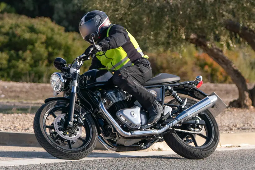 Fotografada na Espanha, a Continental GT 750 mantém a mesma filosofia de custo-benefício, com garfos dianteiros convencionais e amortecedores traseiros duplos – aparentemente com ajuste apenas de pré-carga. Um par de freios a disco dianteiros e pinças Bybre substituem o sistema de disco único encontrado no modelo atual.