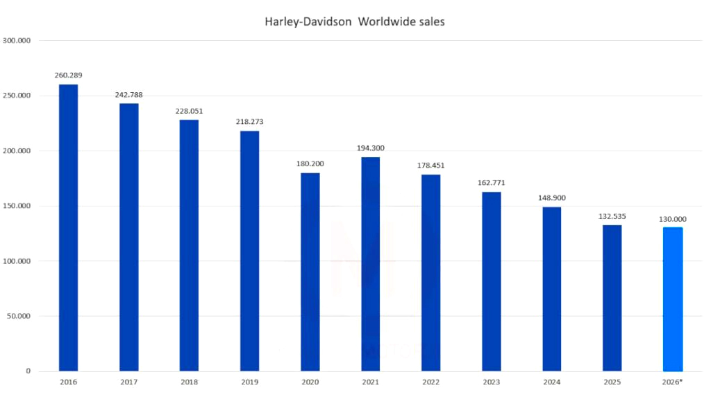 Foram 132.535 unidades entregues globalmente em 2025 ao passo em 2024 haviam sido 148.900. Em 2023 foram 162.771. Em 2022, 178.451. É uma tendência negativa que se iniciou em 2015. Naquele ano, a Harley comercializou mais de 265 mil motocicletas, ou seja, praticamente o dobro de agora, 49.98%.