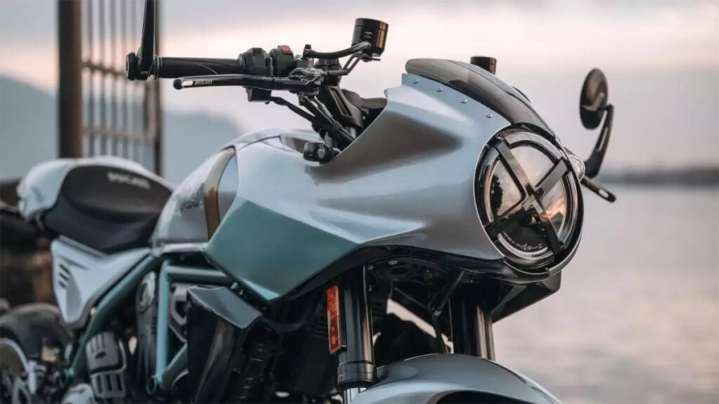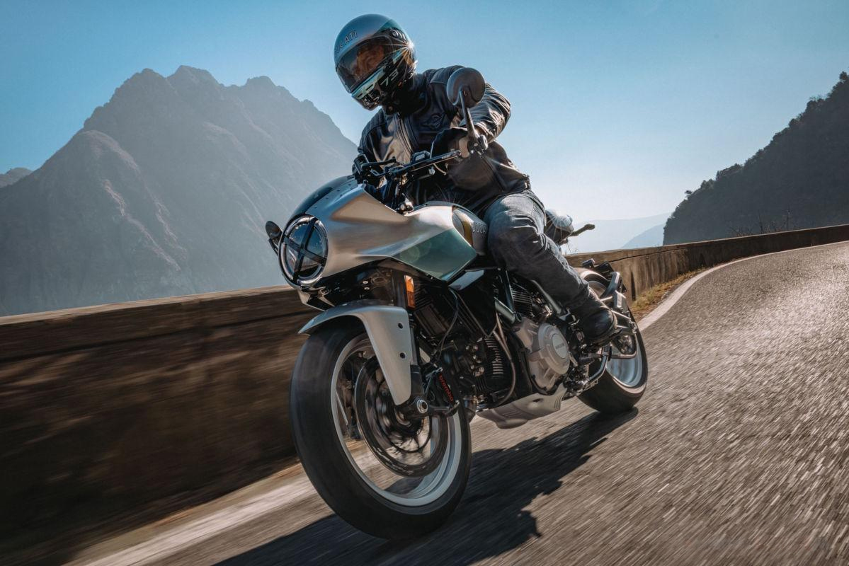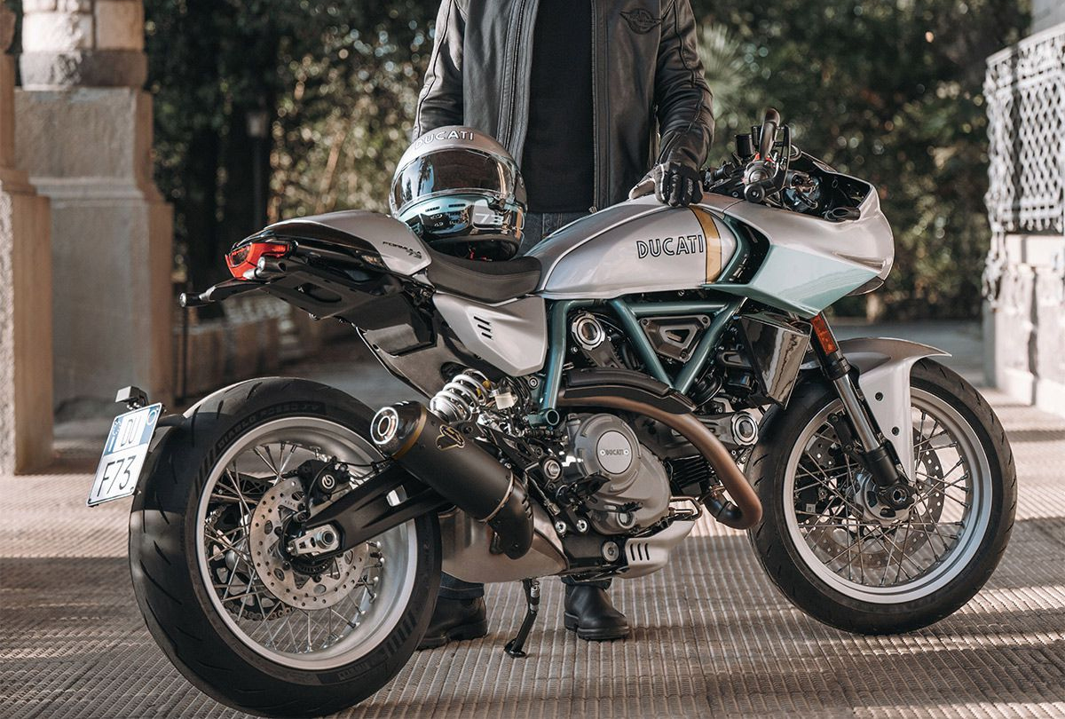 Mas as diferenças mais visíveis são as rodas. Saem de cena os aros de alumínio fundido da Scrambler convencional e entram rodas raiadas de 17 polegadas calçadas com pneus Pirelli Diablo Rosso IV. O guidão clip-on com espelhos retrovisores nas extremidades e a rabeta curta completam o caráter café racer do modelo.